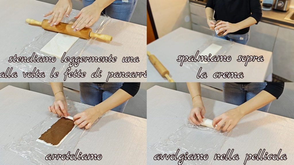 Wir nehmen eine Scheibe nach der anderen und rollen sie leicht aus. Wir streichen die Aufstrichcreme nach Geschmack darauf, rollen sie dann auf und wickeln die entstandene Rolle in Frischhaltefolie ein.
