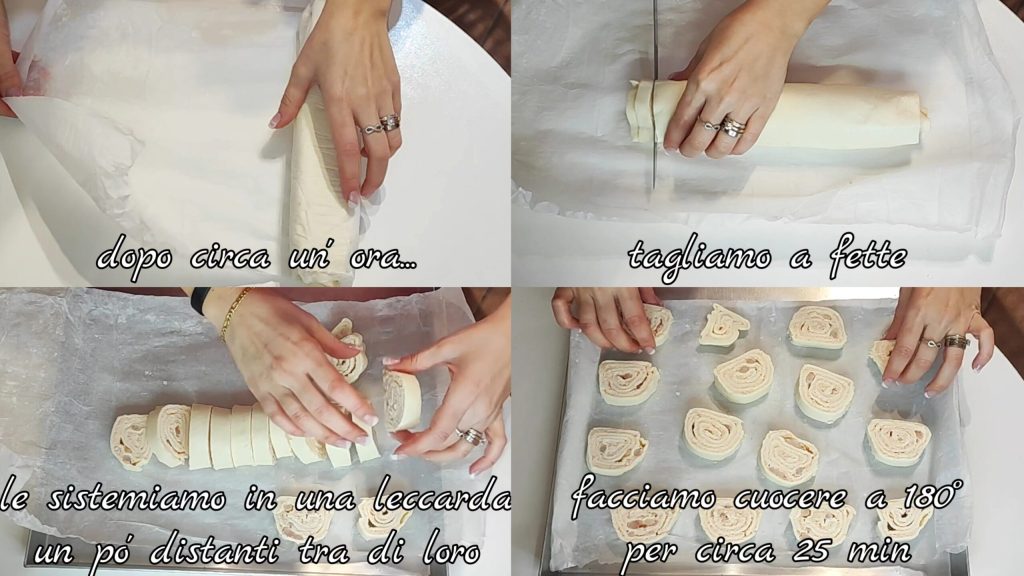 Dann schneiden wir sie in die gewünschte Dicke, um die Schnecken zu erhalten. Wir legen sie auf ein mit Backpapier ausgelegtes Blech und lassen etwas Abstand zwischen ihnen. Bei 180° etwa 25 Minuten backen.