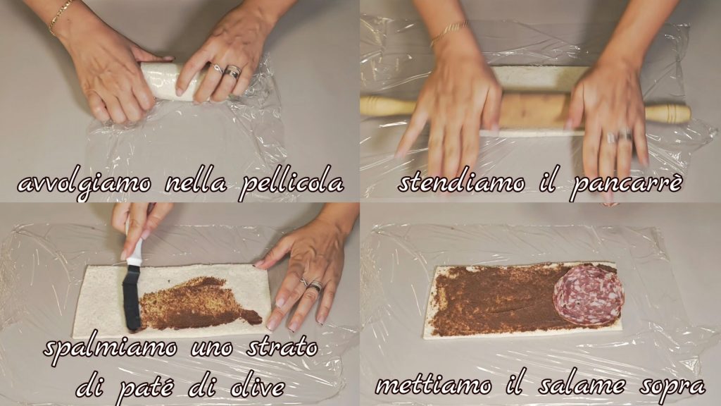• Wir fügen die Oliven und die Salami hinzu. Rollen es ein und wickeln es in Frischhaltefolie.
