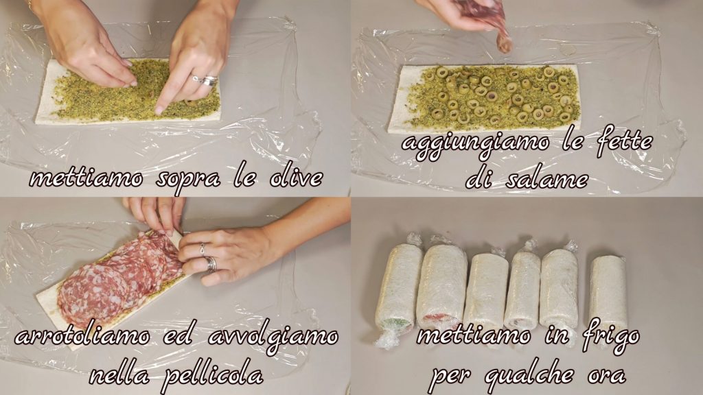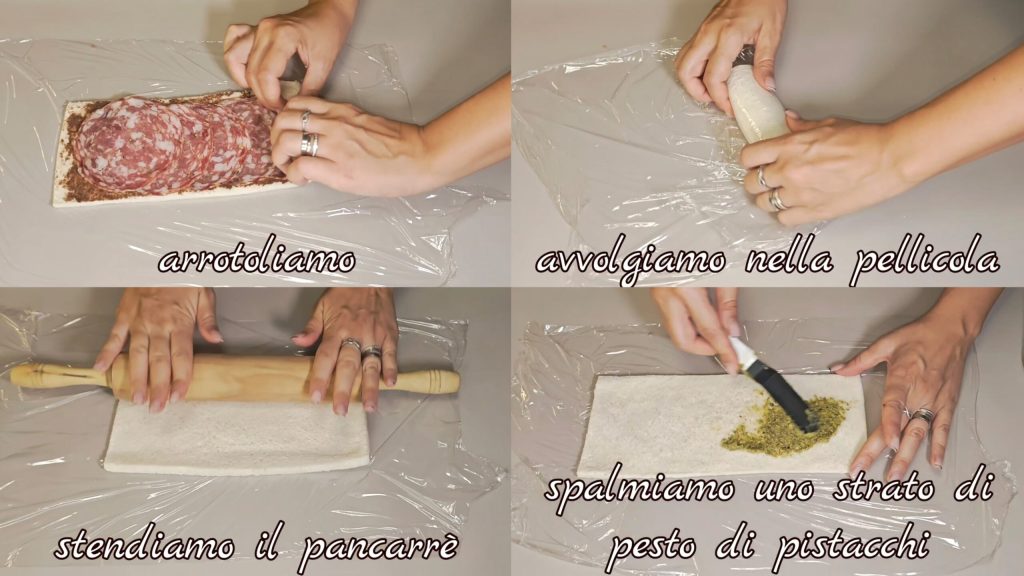 Zubereitung der Röllchen mit Salami und Pistazien: