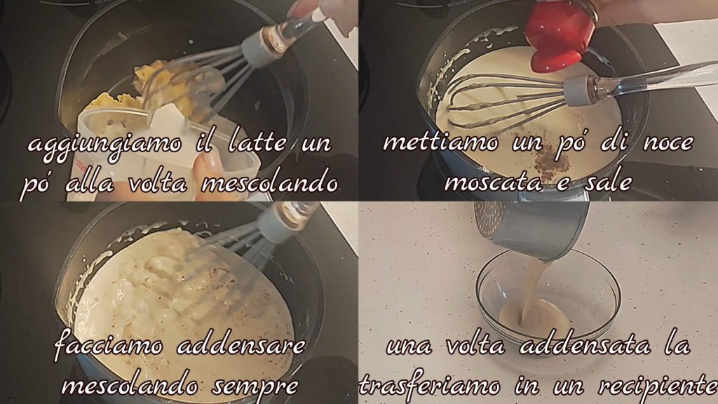 Die Milch nach und nach unter Rühren hinzufügen, um Klumpenbildung zu vermeiden. Etwas Muskatnuss, Salz hinzufügen und unter Rühren kochen, bis die Mischung eindickt. Sobald sie eingedickt ist, in einen Behälter umfüllen,