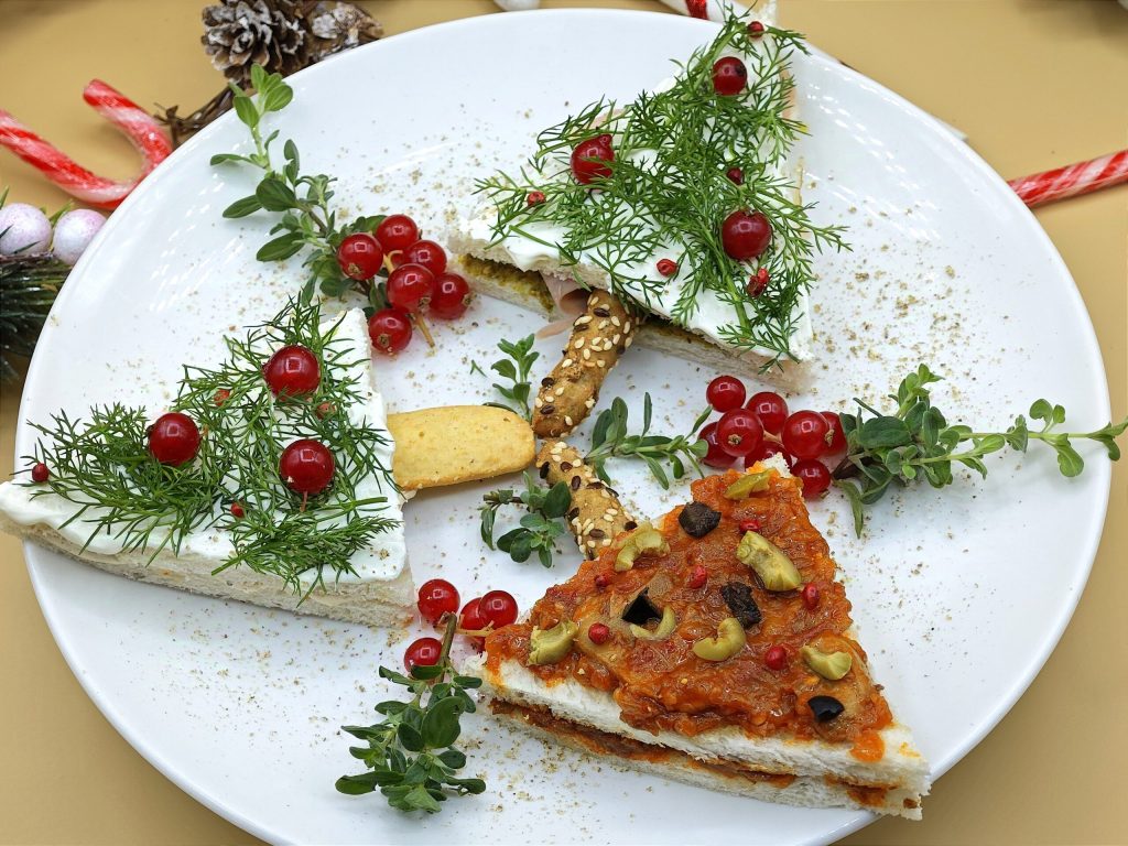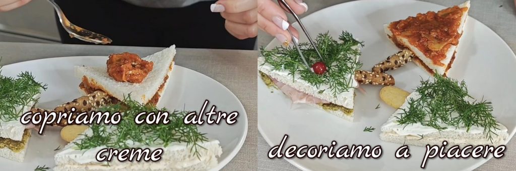 Wir nehmen die Sandwichbrotscheiben und schneiden sie zu Dreiecken. Bestreichen Sie diese nach Belieben mit herzhaften Cremes und decken Sie sie mit einem weiteren Sandwichbrotdreieck ab. Stecken Sie ein Stück Grissini in die Mitte, um die Basis zu bilden.