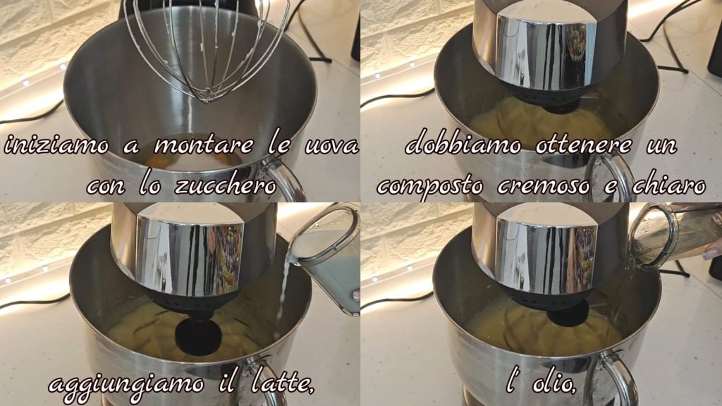 Zuerst beginnen wir damit, die Eier mit dem Zucker zu schlagen, bis eine helle und cremige Mischung entsteht. Fügen Sie die Milch, das Öl hinzu,