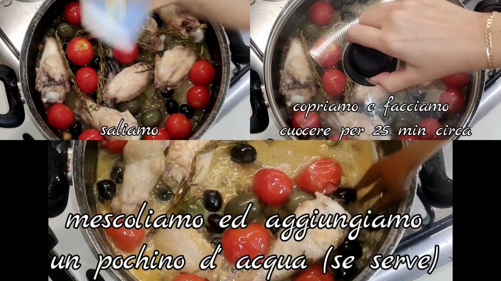 Einige Minuten anbraten lassen. Mit Weißwein ablöschen. Oliven, Kapern und Kirschtomaten hinzufügen.