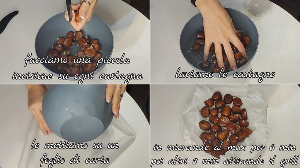 Zuerst nehmen wir eine Kastanie nach der anderen und machen einen kleinen Schnitt in der Mitte. Die Kastanien gut waschen und auf ein Blatt Backpapier legen. Bei maximaler Leistung 6 Minuten in der Mikrowelle garen, dann die Grillfunktion aktivieren und weitere 3 Minuten garen (die Garzeit kann je nach Größe der Kastanien variieren, meine waren mittelgroß, wenn sie größer sind, die Garzeit um ein paar Minuten verlängern, wenn sie kleiner sind, verkürzen).