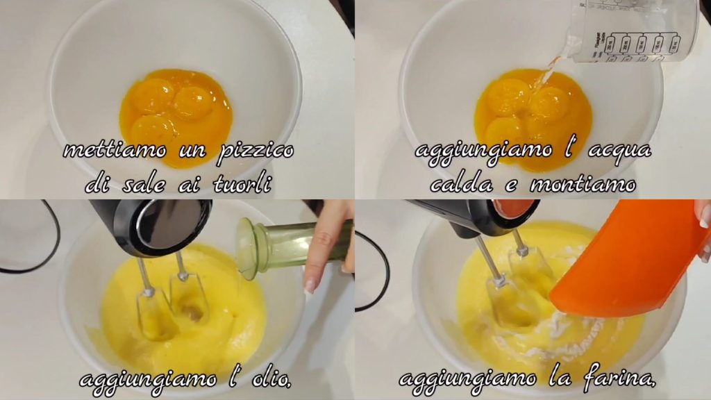 • Eine Prise Salz über die Eigelbe streuen, warmes Wasser hinzufügen und aufschlagen. Öl hinzufügen und vermengen. Mehl hinzufügen