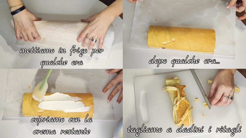 • Für einige Stunden in den Kühlschrank stellen. Nach ein paar Stunden mit der restlichen Creme bedecken. Die Abschnitte in Würfel schneiden.