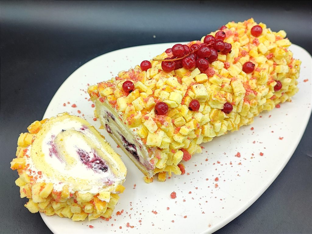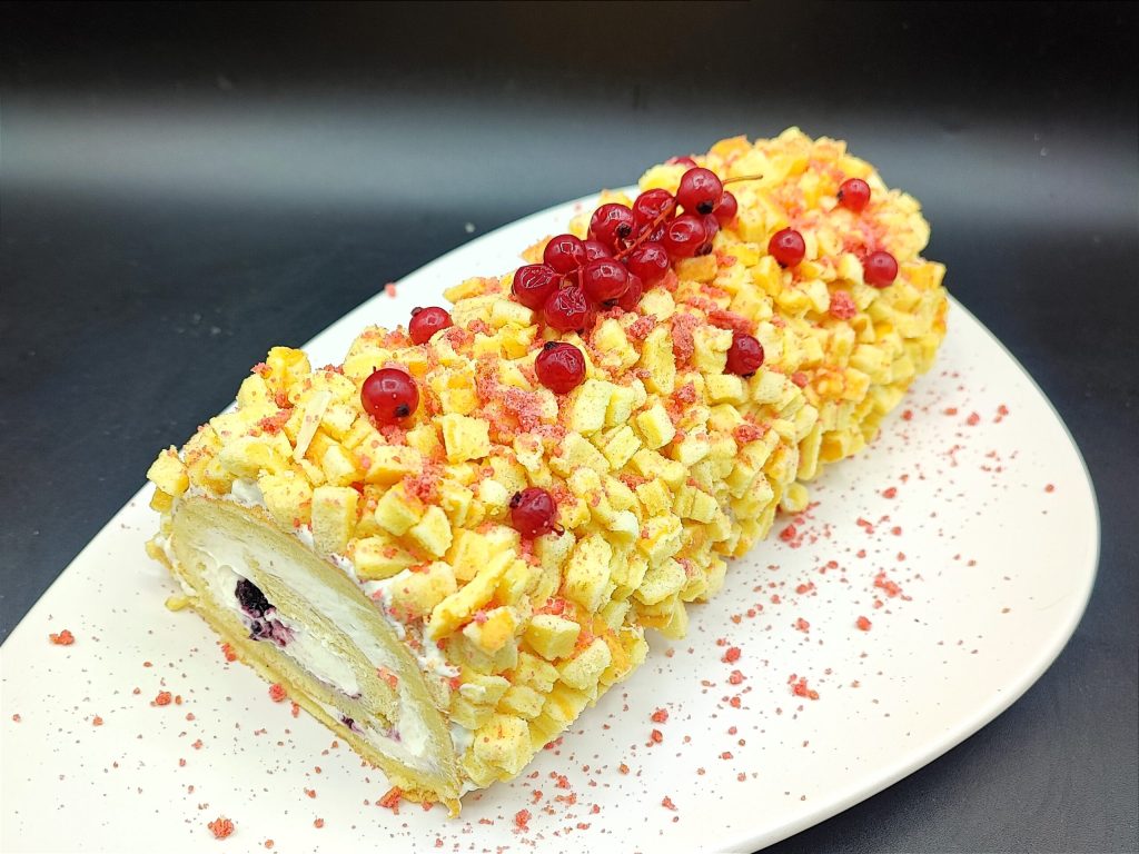 Mimosa-Rolle mit Creme und Waldfrüchten