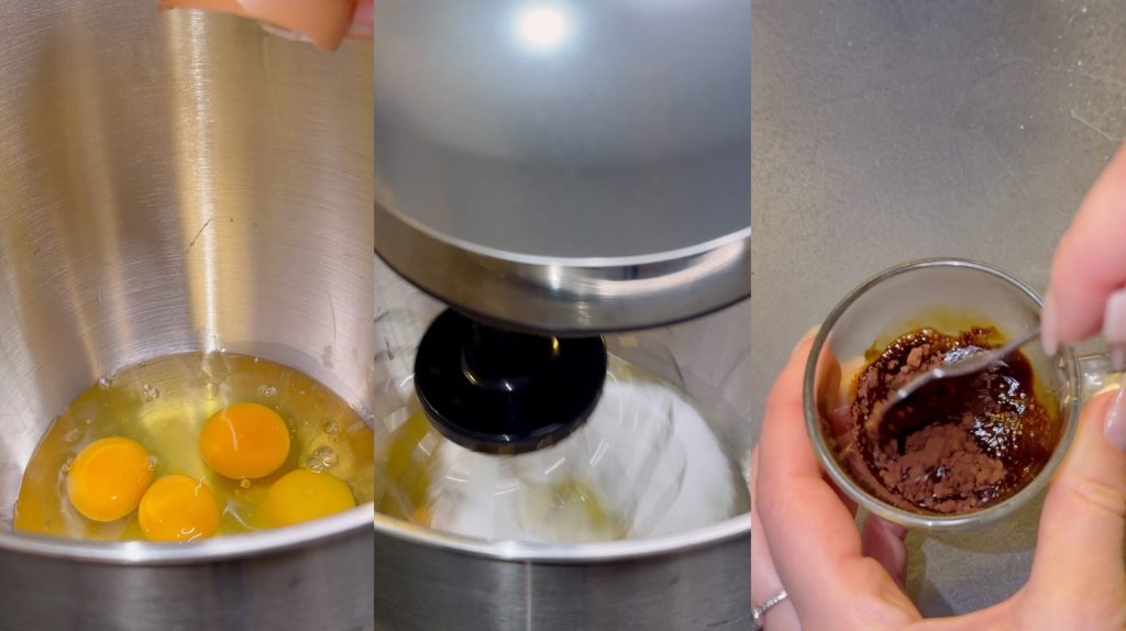 Die Eier mit dem Zucker schlagen, bis eine helle, schaumige Masse entsteht. Den Instantkaffee in ganz wenig heißem Wasser auflösen.