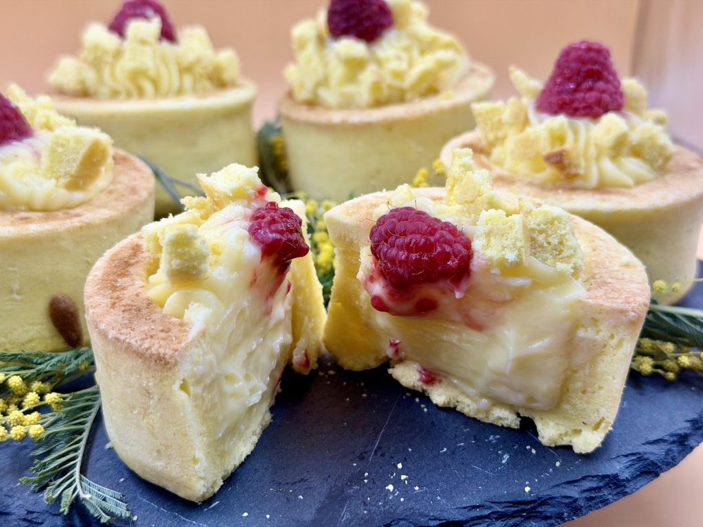 Wir gießen die Mischung in die Törtchenformen. Den restlichen Teig geben wir in eine Form: Er wird für die finale Mimosa-Dekoration benötigt. Wir backen bei 180°C für etwa 20 Minuten. Vollständig abkühlen lassen.
