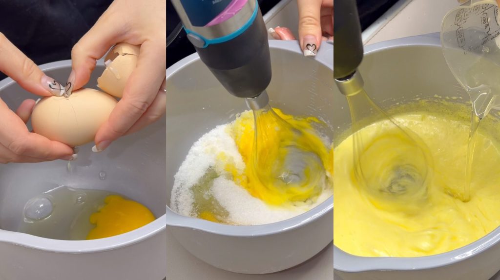 In einer Schüssel schlagen wir die Eier mit dem Zucker, bis sie hell und schaumig sind. Wir fügen das Öl hinzu,