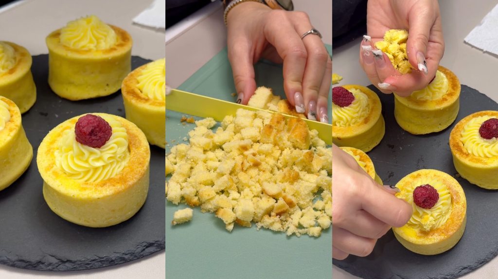 Wir dekorieren mit Früchten nach Wahl. Wir schneiden den vorbereiteten Biskuit in Würfel und verteilen ihn auf den Törtchen, um den klassischen Mimosa-Effekt zu erzeugen.