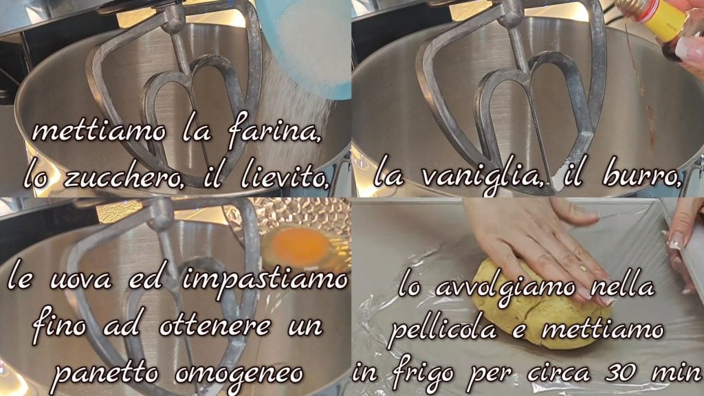 Wir geben das Mehl, den Zucker, das Backpulver, die Vanille, die Butter und die Eier hinein und kneten, bis wir einen homogenen Teigball erhalten. Sobald er fertig ist, wickeln wir ihn in Frischhaltefolie und legen ihn für etwa 30 Minuten in den Kühlschrank.