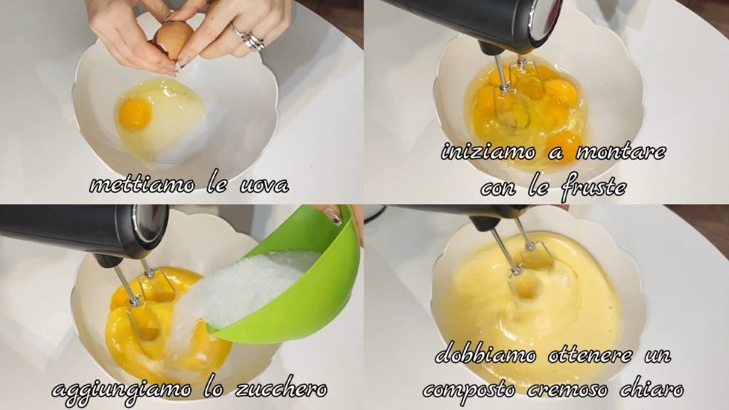 In einem Behälter die Eier geben und anfangen zu schlagen. Den Zucker nach und nach hinzufügen. Wir müssen eine helle und cremige Masse erhalten.