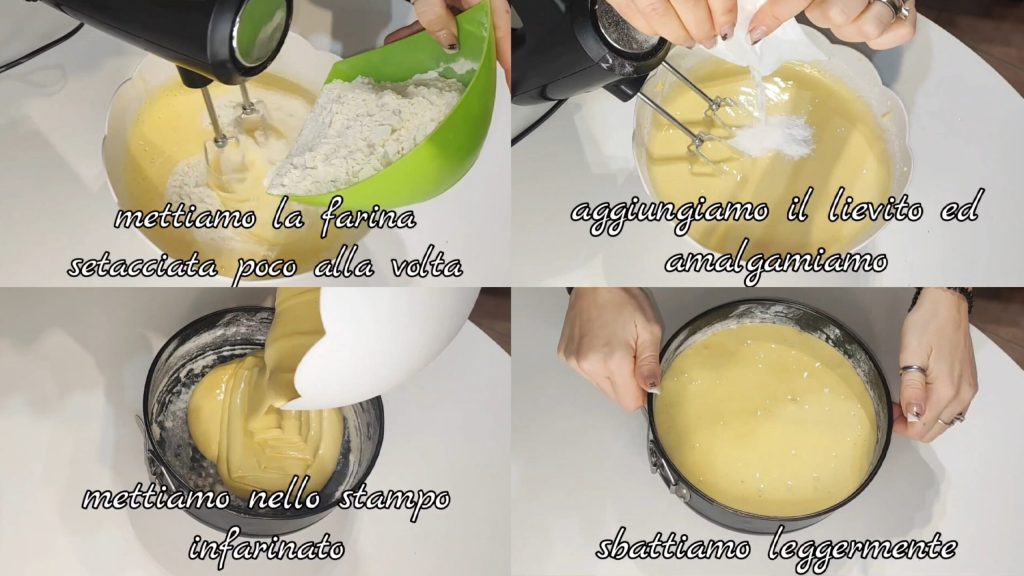 Das Mehl nach und nach hinzufügen und das Backpulver. Die erhaltene Masse in eine bemehlte Form geben und leicht schlagen.