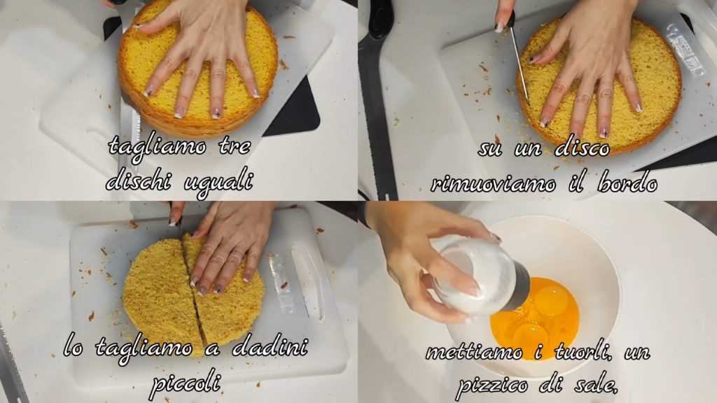 bei 180°C für etwa 40/50 Min. backen. Gut abkühlen lassen, dann aus der Form nehmen, den Boden und auch die obere (möglichst dünne) Schicht abschneiden.