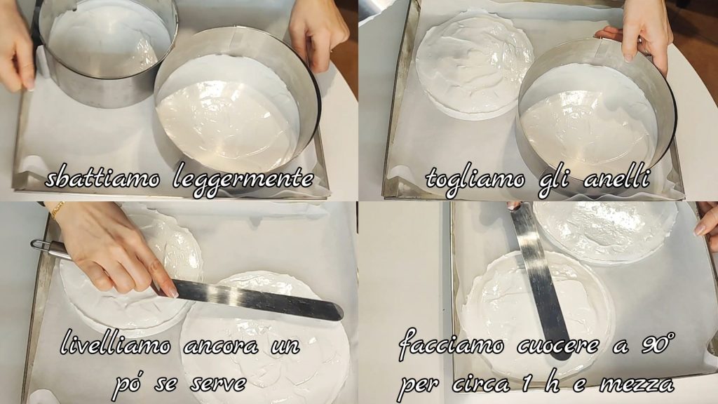 Leicht schlagen, dann die Ringe entfernen. Nochmals glattstreichen, falls nötig, dann bei 90°C für etwa 1 Stunde und 30 Minuten backen.