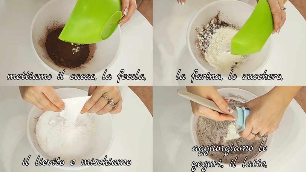 In einer Schüssel mischen wir Kakao, Stärke, Mehl, Zucker, Backpulver. Dann fügen wir Joghurt, Milch hinzu.