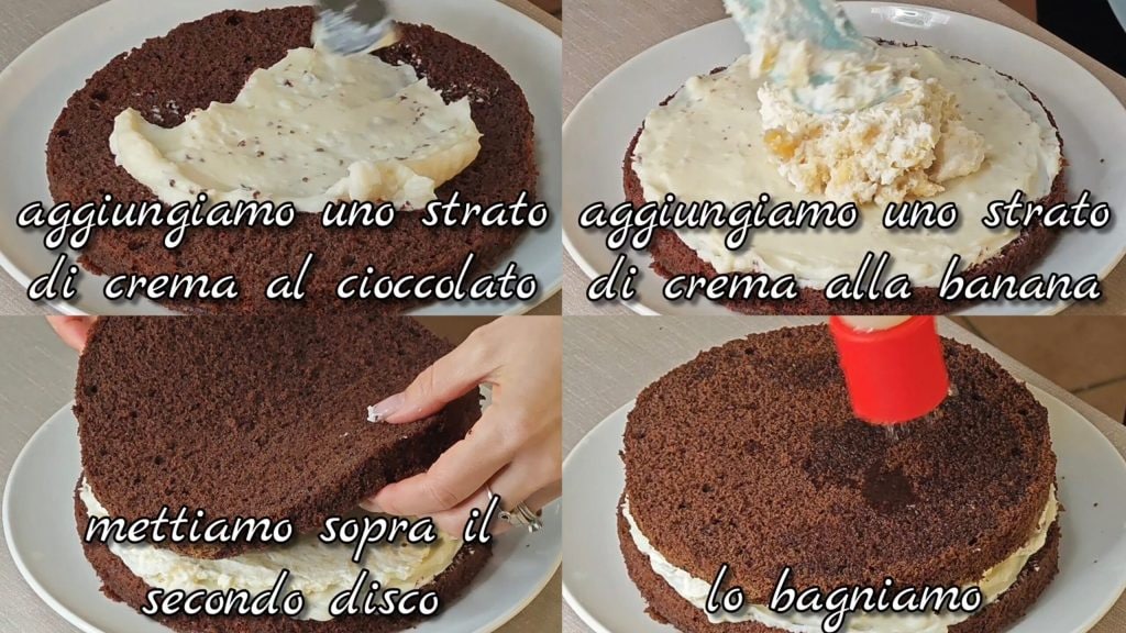 fügen eine Schicht Schokoladencreme und eine Schicht Bananencreme hinzu. Wir legen die zweite Scheibe darauf, tränken sie,