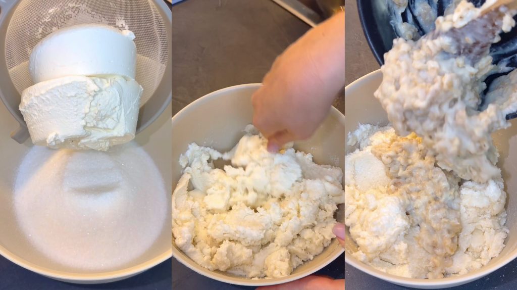 In eine Schüssel gebe ich gut abgetropfte Ricotta und den Zucker.