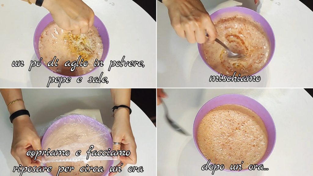 etwas Knoblauchpulver, Pfeffer und Salz. Mischen, abdecken und etwa 1 Stunde ruhen lassen.