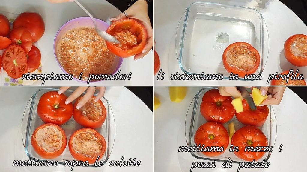 Dann füllen wir die Tomaten mit der erhaltenen Mischung. Wir legen sie in eine Auflaufform und bedecken sie mit den Deckeln. Die Kartoffelstücke dazwischenlegen.