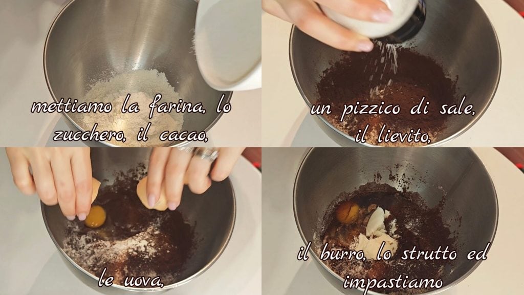 Wir geben Mehl, Zucker, Kakao, eine Prise Salz, Backpulver, Eier, Butter, Schmalz und kneten.