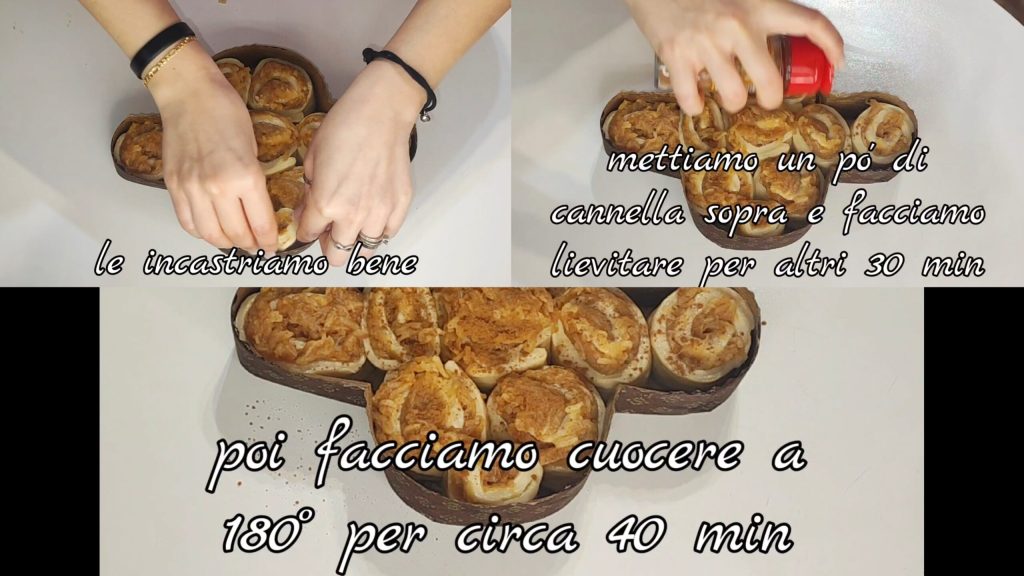 Einen Rand an einer Seite frei lassen. Aufrollen und in Scheiben schneiden, um die Schnecken (10/12) zu erhalten. In eine Taubenform legen.