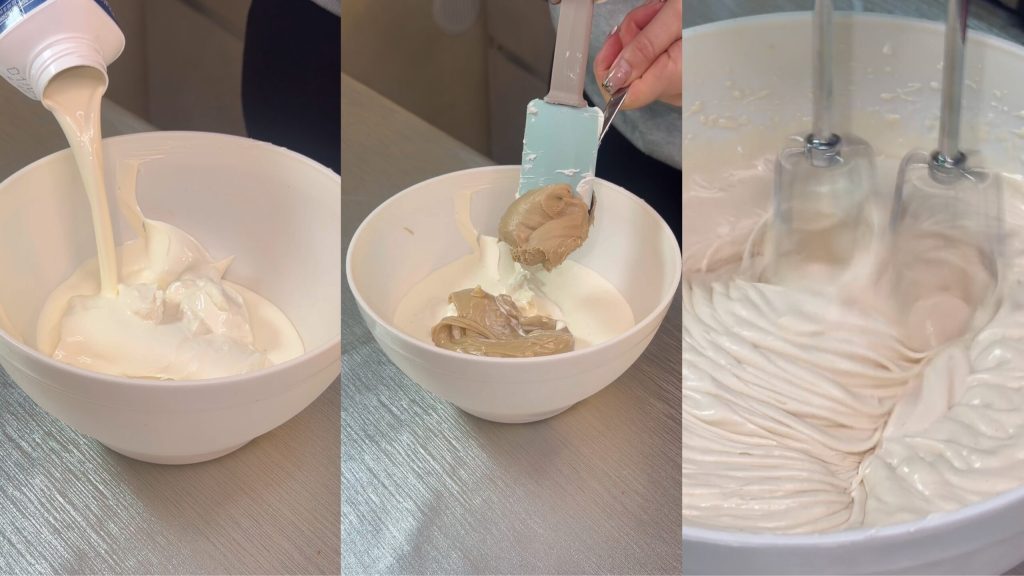 Schlagen Mascarpone, Sahne und weiße Haselnusscreme in einer Schüssel, bis eine glatte und schaumige Mischung entsteht.