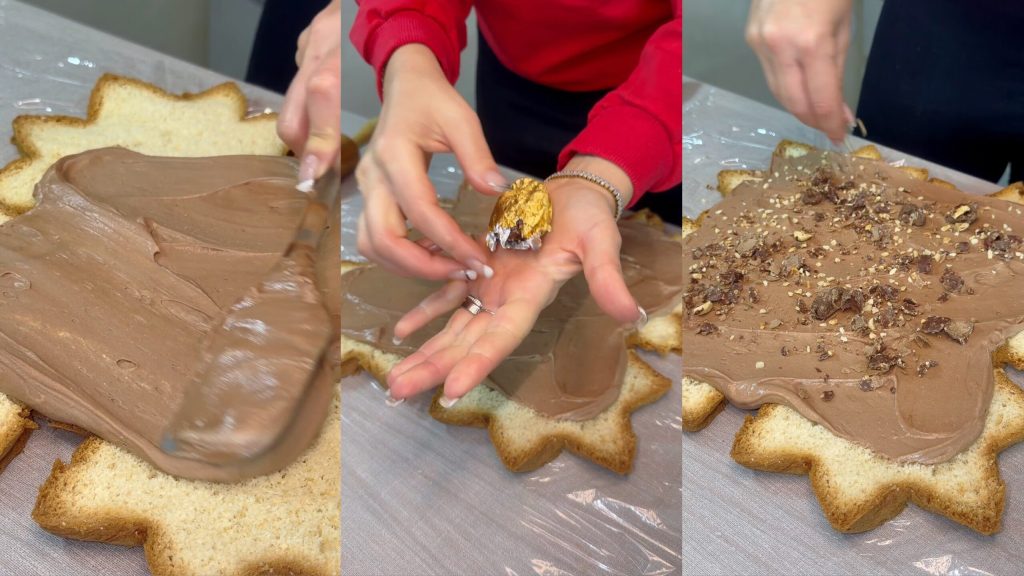 Verteile etwa drei Viertel der Creme gleichmäßig auf der Pandoro-Basis. Brösele einige Ferrero Rocher direkt über die Creme. Füge etwas Haselnusskrokant hinzu.