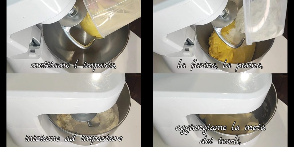 Nachdem das Volumen verdreifacht ist, geben wir ihn wieder in den Kessel der Küchenmaschine. Wir fügen das Mehl, die Sahne hinzu und beginnen zu kneten. Wir fügen die Hälfte der Eigelbe hinzu