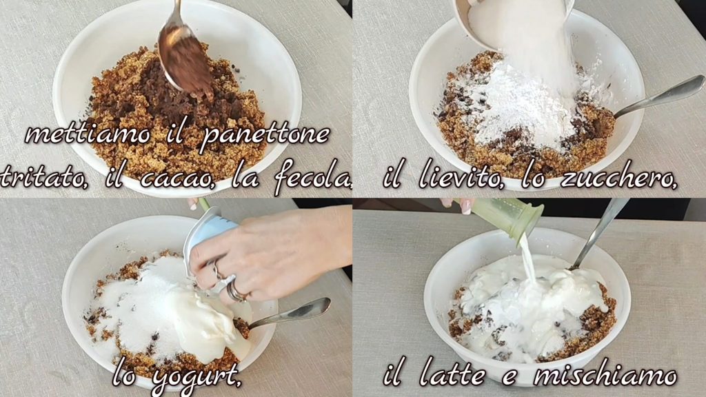Zuerst zerkleinern wir den Panettone oder Pandoro fein. Wir fügen Kakao, Kartoffelstärke, Backpulver, Zucker, Joghurt, Milch hinzu und mischen.