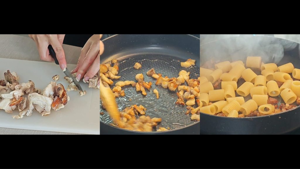 In der Zwischenzeit bringe gesalzenes Wasser zum Kochen und koche die Pasta (z.B. Penne, Rigatoni oder Spaghetti) al dente. Hebe etwas Kochwasser auf.