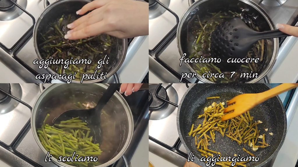 Die geputzten Spargel hineingeben und etwa 7 Minuten kochen. Abtropfen lassen und zum angebratenen Knoblauch geben.
