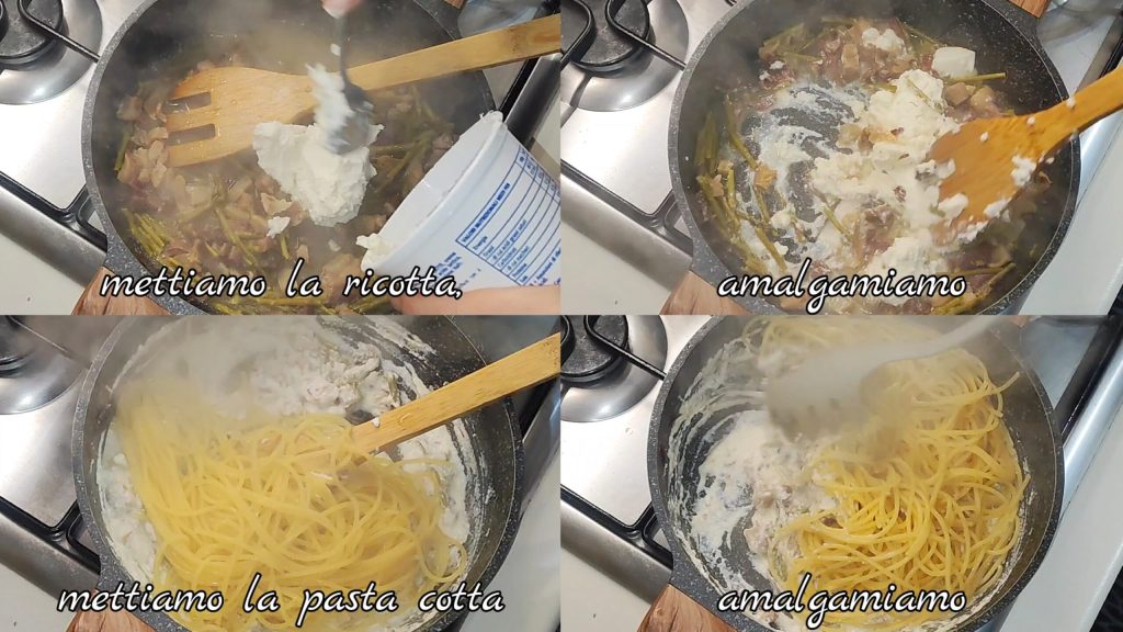 Zum Schluss die Ricotta hinzufügen und vermengen. In der Zwischenzeit die Pasta kochen, abtropfen und hinzufügen.