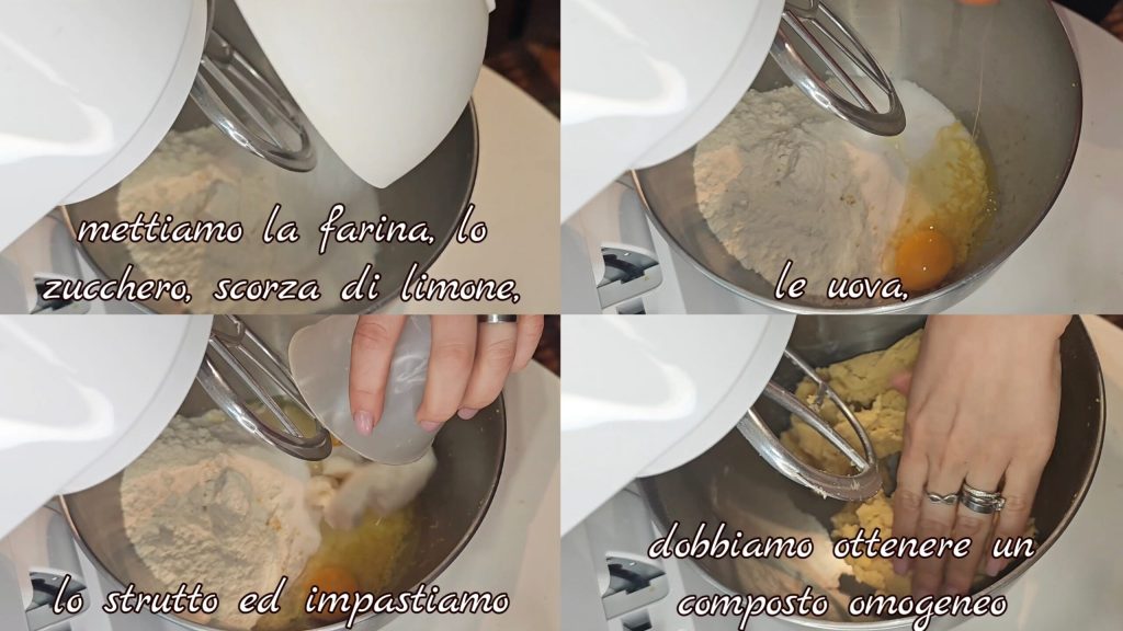 Wir geben Mehl, Zucker, Zitronenschale, Eier, Schmalz hinzu und kneten es. Wir müssen eine homogene Mischung erhalten.