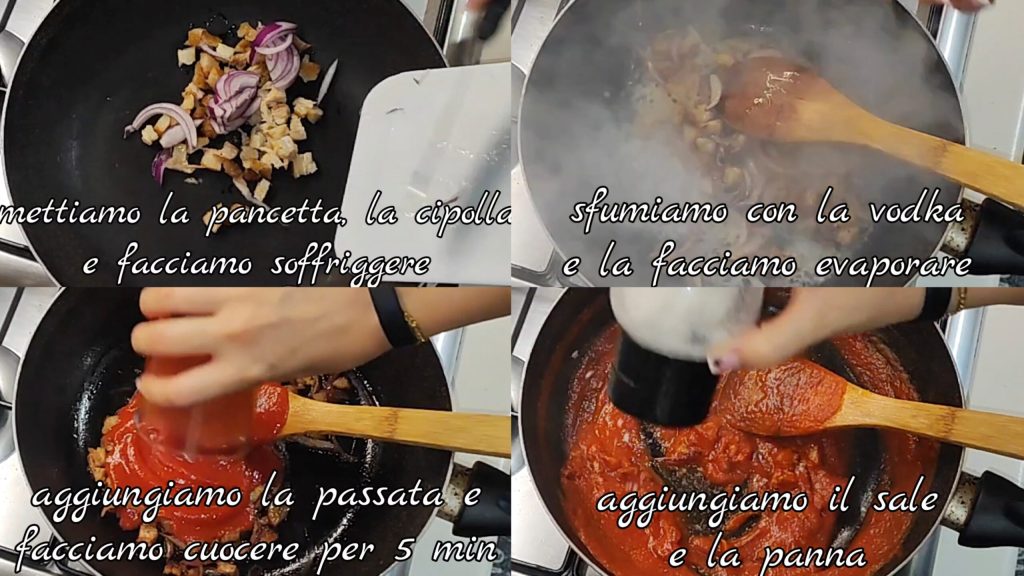 • In einem Topf die Zwiebel und den Speck anbraten. Mit Wodka ablöschen und verdampfen lassen. Die Tomatensauce hinzufügen und etwa 5 Minuten kochen lassen. Etwas Salz und die Sahne hinzufügen.