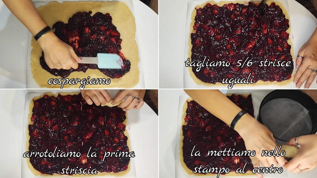 Verteilen. 5/6 gleiche Streifen schneiden. Den ersten Streifen auf sich selbst aufrollen und in der Mitte der Form platzieren.