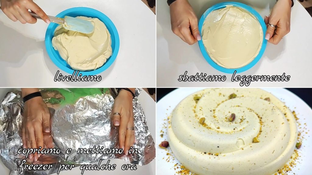 In eine Schüssel geben wir die Pistaziencreme, den Zucker, den Mascarpone und vermischen alles gut mit einem elektrischen Handrührgerät. Wir fügen die Sahne hinzu und schlagen mit dem Handrührgerät, bis wir eine homogene und cremige Mischung erhalten. Wir geben die erhaltene Mischung vorzugsweise in eine Silikonform, andernfalls kann jede Form verwendet werden, muss jedoch mit Frischhaltefolie ausgelegt werden, um das Herauslösen aus der Form zu erleichtern.