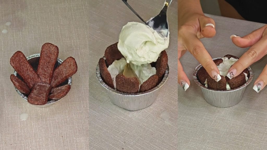 Tauche die Löffelbiskuits in Milch und lege sie dann in Muffinformen. Gebe eine Schicht Creme hinzu, füge einen Teelöffel Pistaziencreme hinzu und dann noch eine Schicht Creme. Schließe mit den Pavesini ab. Wickel es in Frischhaltefolie und stelle es für ein paar Stunden in den Kühlschrank.