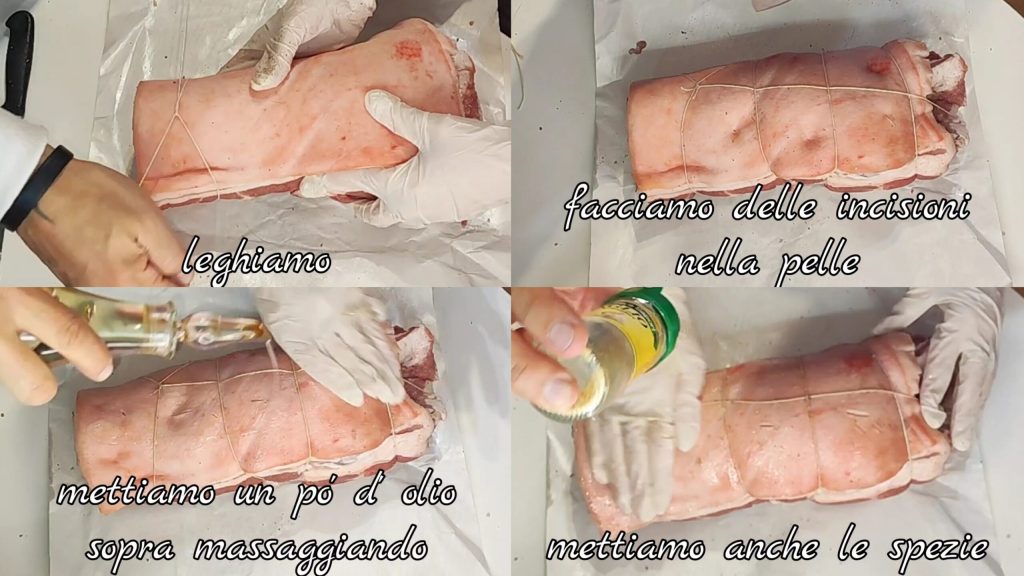 Die Porchetta binden. Einschnitte in die Haut machen, dann etwas Öl hinzufügen und erneut massieren. Auch die Gewürze hinzufügen.