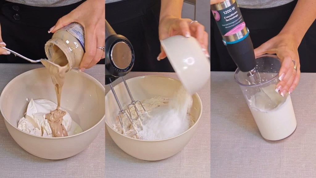 In einer Schüssel Mascarpone mit Kondensmilch vermengen. Die geschmolzene weiße Schokolade und die Kokosraspeln hinzufügen. Die gut gekühlte Sahne steif schlagen.vorsichtig unter die Creme heben, mit langsamen Bewegungen von unten nach oben