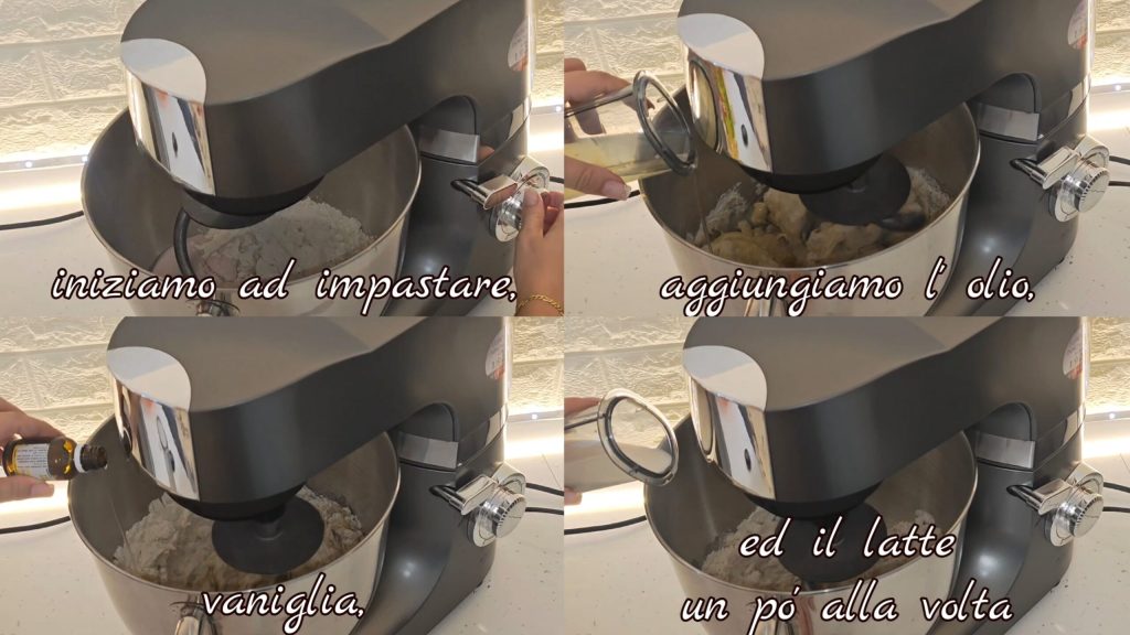 anfangen zu kneten. Öl, Vanille und die Milch nach und nach hinzufügen.
