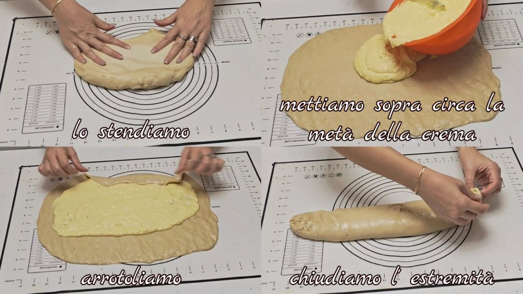 Den ersten Teil ausrollen und etwa die Hälfte der Füllung darauf verteilen. Aufrollen, die Enden schließen