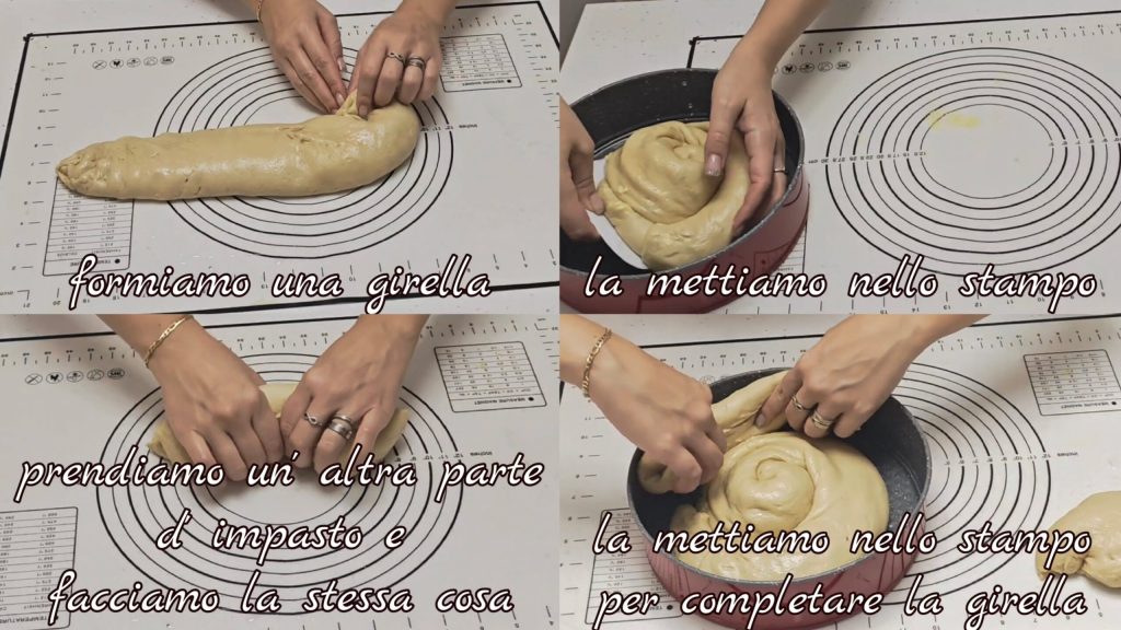 dann erneut aufrollen, um die Schnecke zu formen. In die Mitte der Form legen. Ein weiteres Teigstück ausrollen und dasselbe machen. In die Form legen, um die Schnecke zu vollenden.