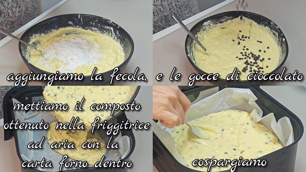 Wir fügen die Kartoffelstärke und die Schokoladenstückchen hinzu, dann mischen wir. Wir geben die erhaltene Mischung in die Heißluftfritteuse mit Backpapier. Streuen wir es gut