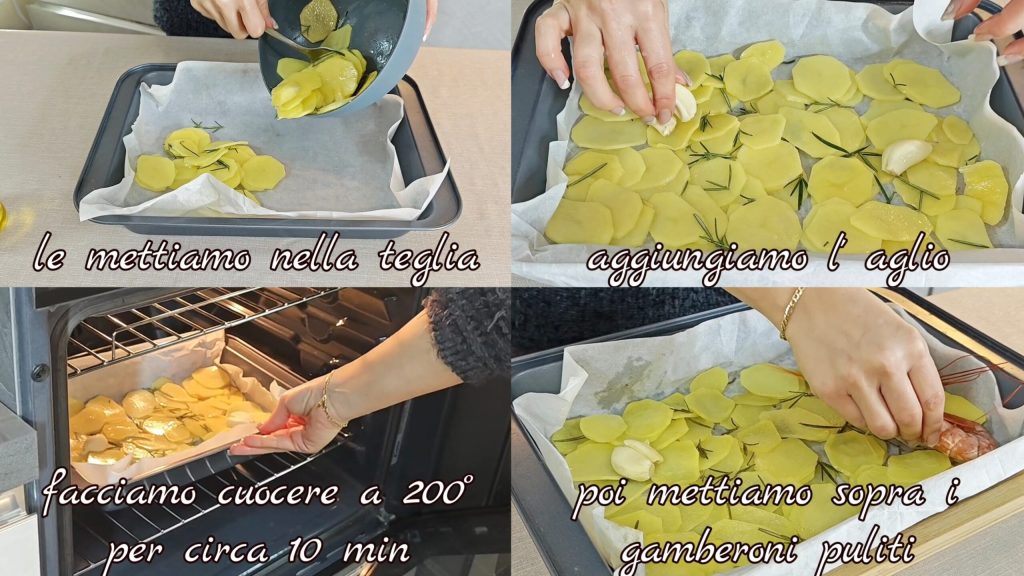 Zuerst schälen, waschen und in sehr dünne Scheiben schneiden wir die Kartoffeln (ich habe eine Mandoline benutzt). Wir fügen etwas Öl, Salz und Rosmarin hinzu und mischen. Wir legen sie in die Form und backen sie bei 200° für etwa 10 Minuten. In der Zwischenzeit reinigen und waschen wir die Riesengarnelen. Wir nehmen die Kartoffeln aus dem Ofen und fügen die gereinigten Garnelen hinzu,