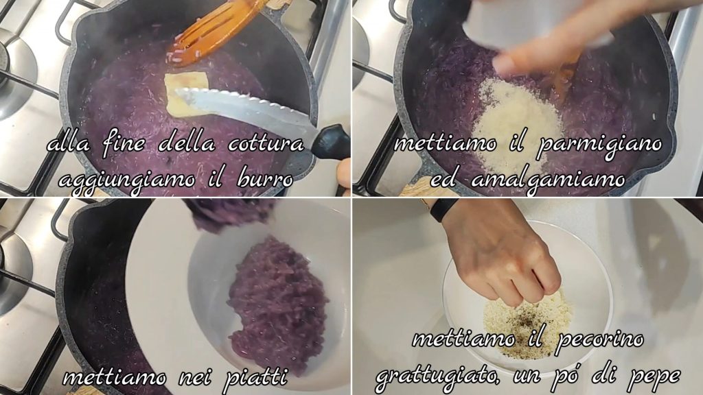 • Am Ende der Kochzeit die Butter, den Parmesan hinzufügen und gut vermischen. Auf die Teller geben. In einem Behälter den geriebenen Pecorino und etwas Pfeffer hinzufügen.