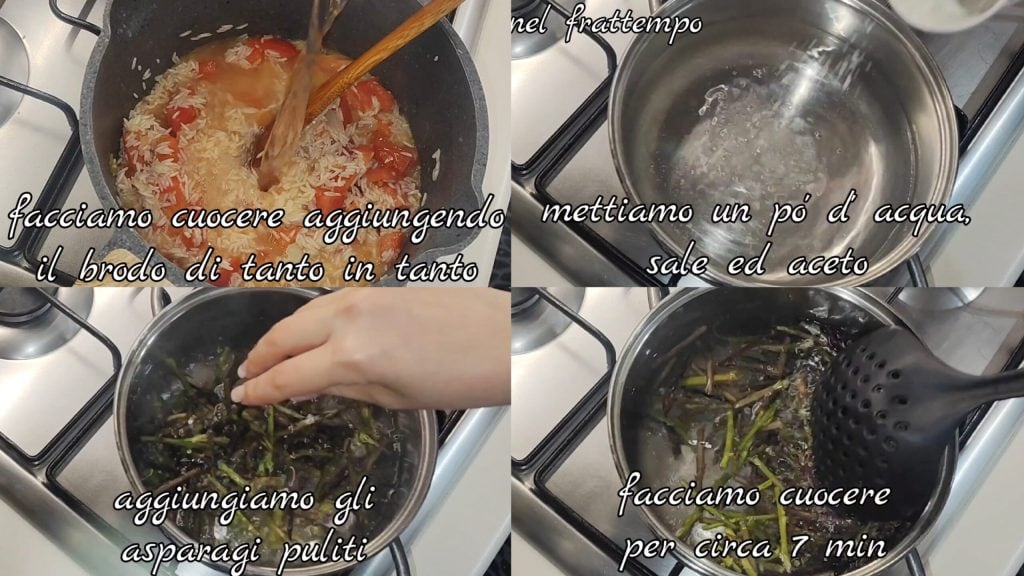 • Den Kochvorgang fortsetzen und bei Bedarf Gemüsebrühe hinzufügen. Inzwischen etwas Wasser, Essig und Salz in einen kleinen Topf geben und den gereinigten und gewaschenen Spargel hinzufügen (meiner ist wild). Abtropfen lassen