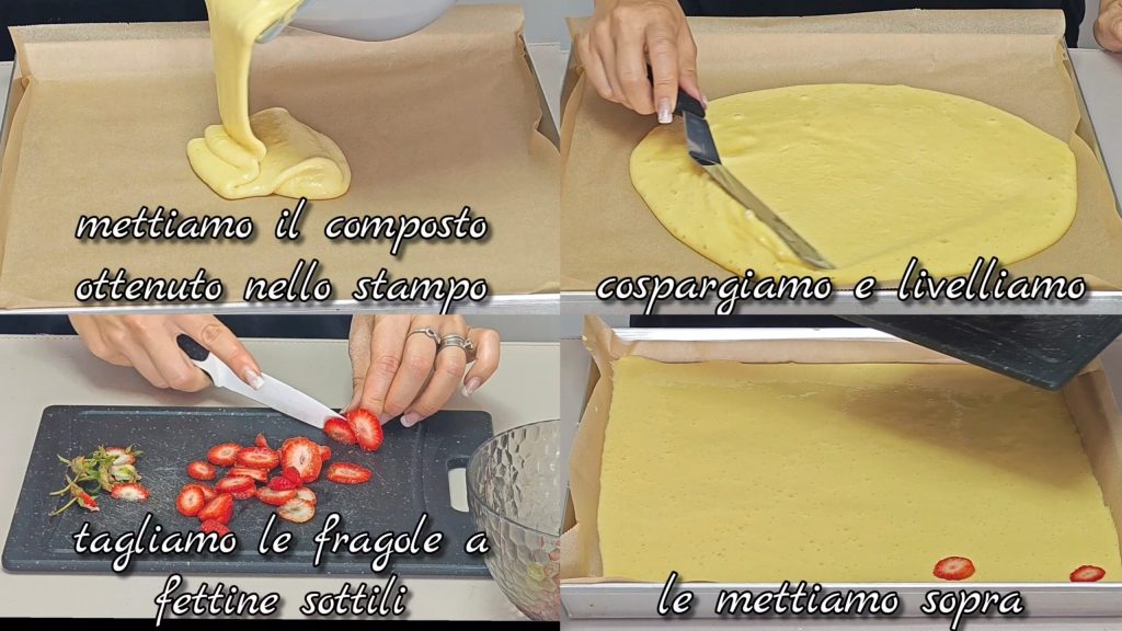 Den erhaltenen Teig in die mit Backpapier ausgelegte Form (35×35 cm) geben. Bestreuen und glätten. Die Erdbeeren in dünne Scheiben schneiden und darauf legen.